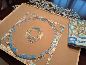 Shortly after the holidays, our daughter broke out “Timeless Turquoise” from Springbok. She promptly gave up on it, having gotten just far enough in for it to take over our table.